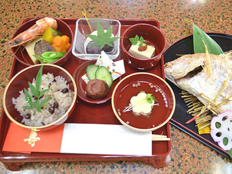 昔ながらの一生食べることに困らないようにとの願いがこもったお食い初め膳をご用意いたします。「一汁三菜」として、ご飯のほかに、汁物が1品とおかずが3品、鯛の塩焼きをお付けしています。その他、ご希望等ありましたらご遠慮なくご相談ください。