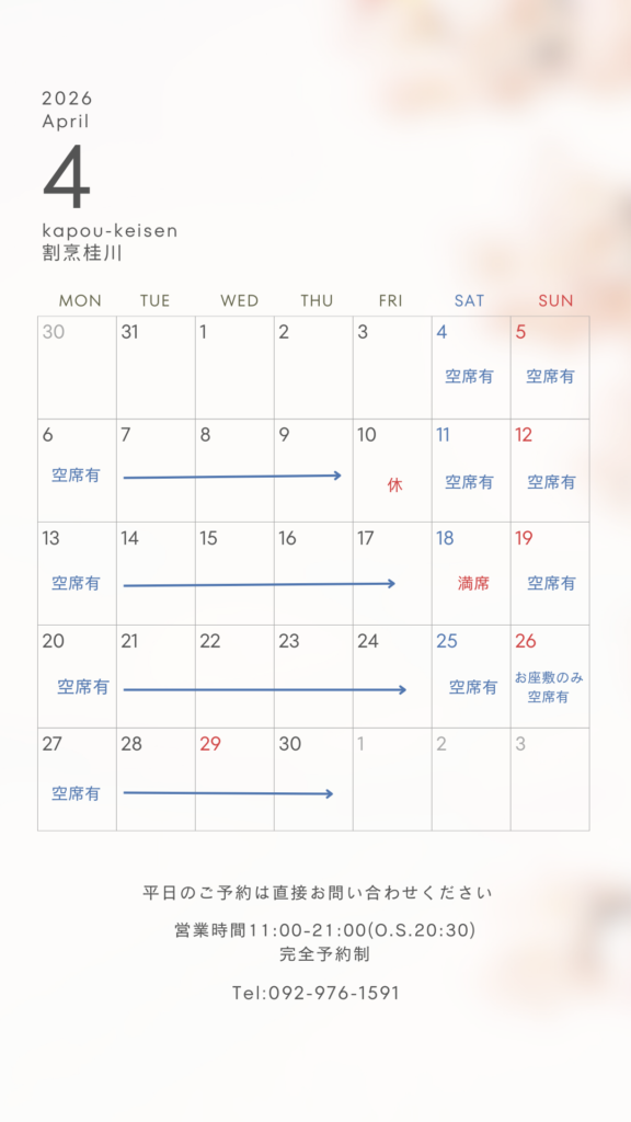 2026年4月ご予約状況のお知らせ|福岡の割烹桂川